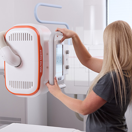 Die Röntgenaufnahme basiert nach wie vor auf dem etablierten Prinzip, bei dem ein bestimmter Bereich des menschlichen Körpers gezielt mit Röntgenstrahlung bestrahlt wird. Die durch den Körper dringenden Röntgenstrahlen treffen auf ein hochsensibles Medium, das sich hinter dem Körper befindet und die unterschiedlichen Dichten von Gewebe und Knochen in verschiedenen Schattierungen abbildet.